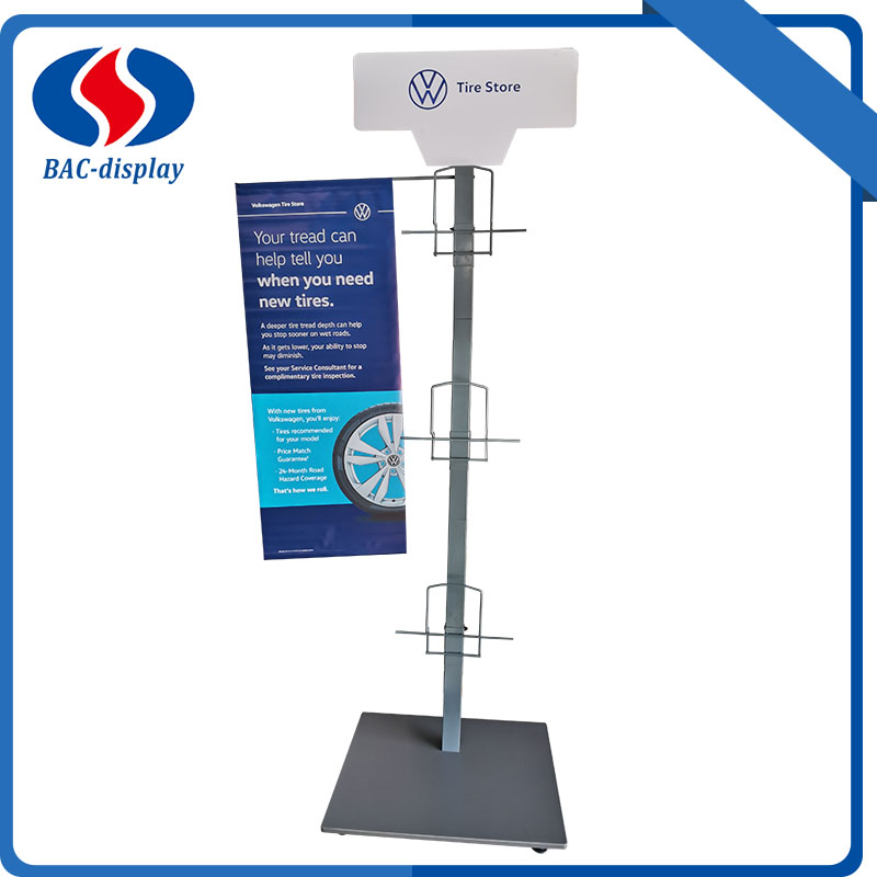 Dette bildæk, der hænger med gulvdisplay, bruges på bilværksteder, dette displaystativ har 3 trådstativ til at understøtte bildækkene. Top har mærkerne fra Volkswagen. Og den ene side. Den har trykkunsten til dækinstruktionen. Displayet er sammenfoldet og nemt at samle, når du har brugt dem. Du kan også justere størrelsen på skærmen, som du vil. Jo flere oplysninger er som følger. Kontakt os, hvis du har spørgsmål til displayet.